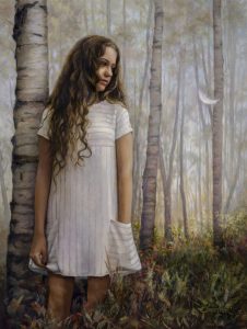Hesitation is about taking a moment to look at what we have before stepping ahead into the unknown. There is a line between the challenging transition of childhood and entering into adolescence. Once it is crossed over, there is no going back. Our childhood is only a memory. For me, it brings a feeling of nostalgia. When creating Hesitation, I placed a feather representing the last stage of freedom as a child. The reluctant girl pauses, giving one last look at what she is leaving, before moving forward.